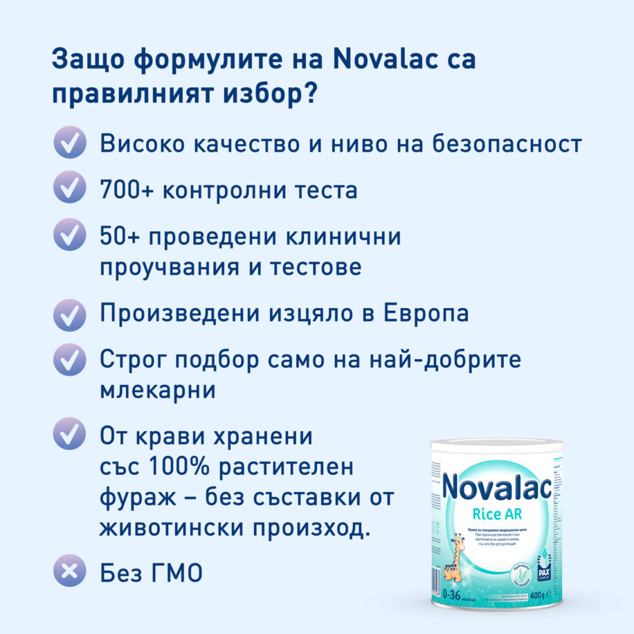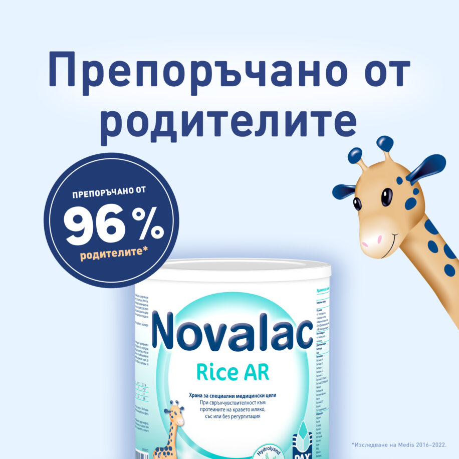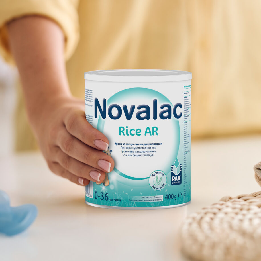 Novalac Rice AR, формула с хидролизиран оризов протеин за кърмачета и малки деца, свръхчувствителни към протеина на кравето мляко, със или без регургитация; не съдържа лактоза, глутен, животински протеини и соя.